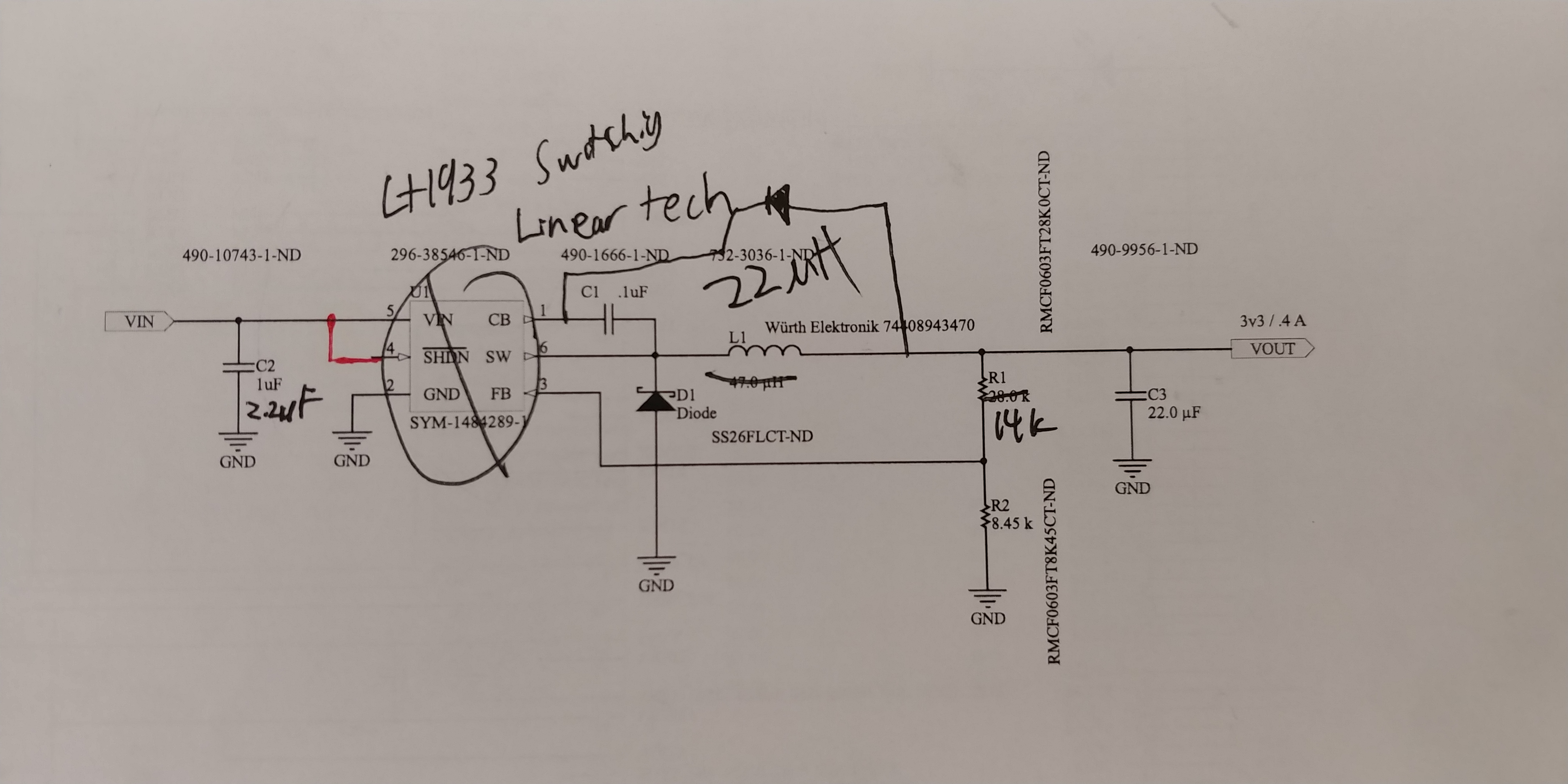 • Switching regulator that was purchased is not compatible with the design. A pin-compatible new one was specc'd and ordered, it is included in the BOM as "alternative" parts. Only U1, L1, C2, and R1 are changed. An 1N4148 diode also needs to be added per LT1933's datasheet. See below schematic: